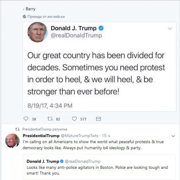 Президентът Доналд Тръмп излезе с нов коментар за масовите протести в Бостън срещу расизма и омразата. „Страната ни е разделена от десетилетия. Понякога е нужен протест, за да се излекуваме. Ще се излекуваме и ще станем по-силни от всякога“ – написа той в Туитър. Тръмп приветства демонстрантите, които успяха да провалят свикания от консерватори и либертарианци „Марш на свободното слово“. Новите му изявления се появиха само два часа след като пак в Туитър президентът нарече левите демонстранти „антиполицейски агитатори“.