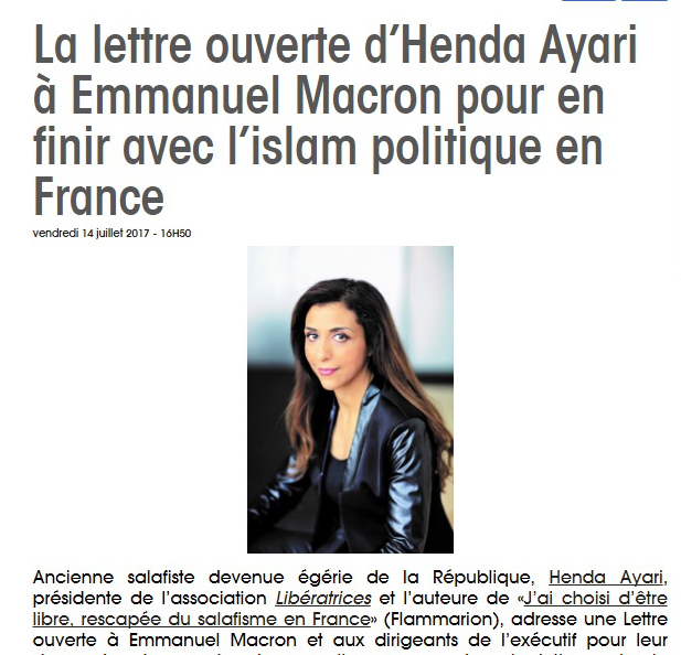 „Избрах да бъда свободна“ – казва Хенда Айари, френска мюсюлманка, която бяга от съпруга си, домашен насилник и привърженик на джихада, и от живота си в радикална салафитска общност. В тази общност тя е била една от „живите мътви“, трябвало е да се покорява безприкословно на всичко и да учи децата си да мразят франзуците, евреите, християните и дори мюсюлманите, които не са салафити. Хенда пише отворено писмо до френския президент Макрон, както и книга, в която споделя своя опит. След като успява да се пребори за себе си, Хенда започва да работи за дерадикализирането на мюсюлманите във Франция и да помага на жени, които напускат радикални общности. Наскоро в „Ню Йорк Таймс“ излезе статия за Айари, озаглавена ‘I Chose To Be Free’.