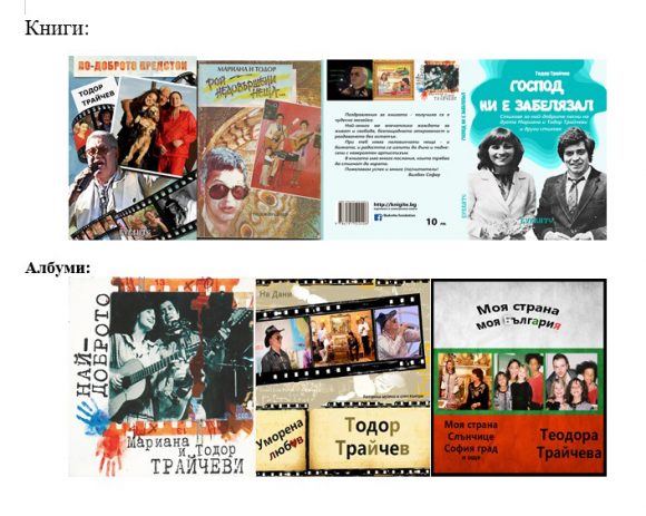 Музикалните албуми са „Най-доброто от Дует Мариана и Тодор Трайчеви“, „Моя страна, моя България“ на Теодора и авторски албум „Уморена любов“ с българска музика в стил „кънтри“.