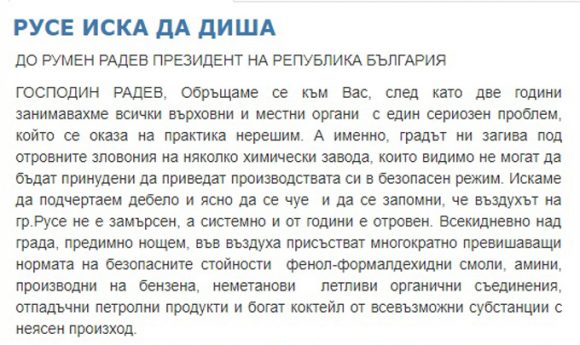 Обръщаме се към Вас, след като две години занимавахме всички върховни и местни органи с един сериозен проблем, който се оказа на практика нерешим. А именно, градът ни загива под отровните зловония на няколко химически завода, които видимо не могат да бъдат принудени да приведат производствата си в безопасен режим. Искаме да подчертаем дебело и ясно да се чуе и да се запомни, че въздухът на гр. Русе не е замърсен, а системно и от години е отровен. Всекидневно над града, предимно нощем, във въздуха присъстват многократно превишаващи нормата на безопасните стойности фенол-формалдехидни смоли, амини, производни на бензена, неметанови летливи органични съединения, отпадъчни петролни продукти и богат коктейл от всевъзможни субстанции с неясен произход.