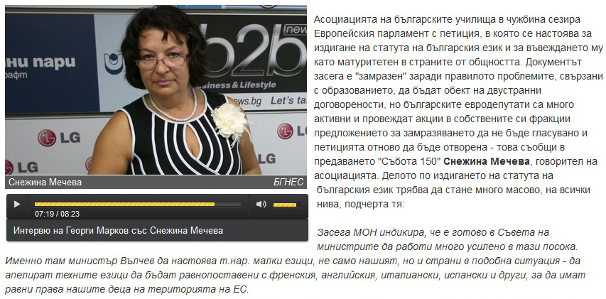 Това е една от важните теми, за които говори на 29 юли в предаването „Събота 150“ на Българското национално радио Снежина Мечева, директор на Българското училище „Иван Станчов“ към Посолството ни в Лондон и говорител на АБУЧ. Делото за изгдигането на статута на българския език трябва да бъде подето на всички нива и да стане масово – казва още тя – да стане национална кауза. Г-жа Мечева се надява и, че този въпрос ще стане една от основните насоки на предстоящото българско председателство на Европейския съюз. И споменава за признаването на българския език, който влезе в програмата Печат за двуезичност в щата Илинойс и в други щати.