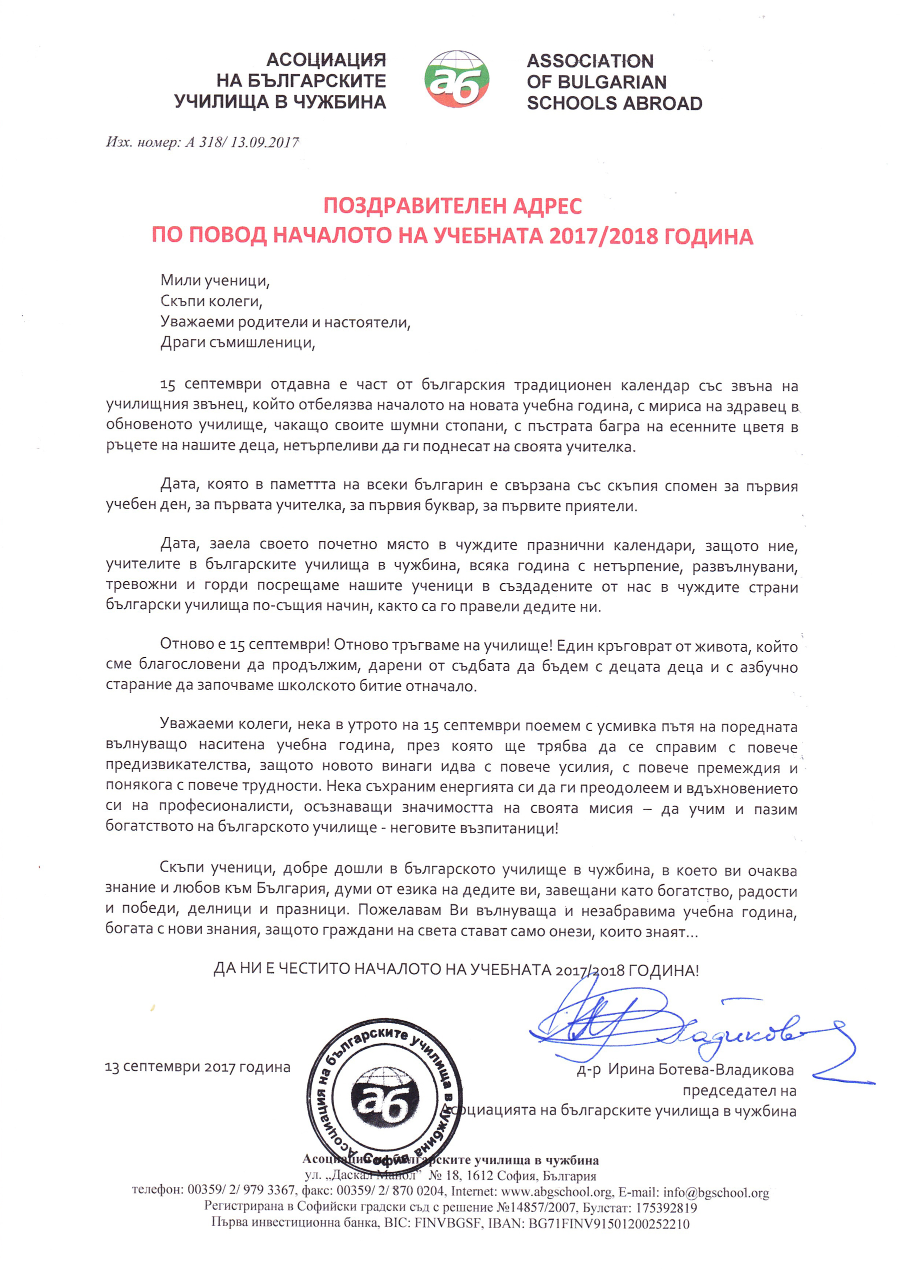 Асоциацията на българските училища в чужбина излезе с поздравителен адрес към всички ученици, учители, родители, настоятели от българските училища зад граница, във връзка с началото на учебната 2017-2018 година. Аресът, подписан от председателя на АБУЧ д-р Ирина Ботева-Владикова, може да се види по-долу.