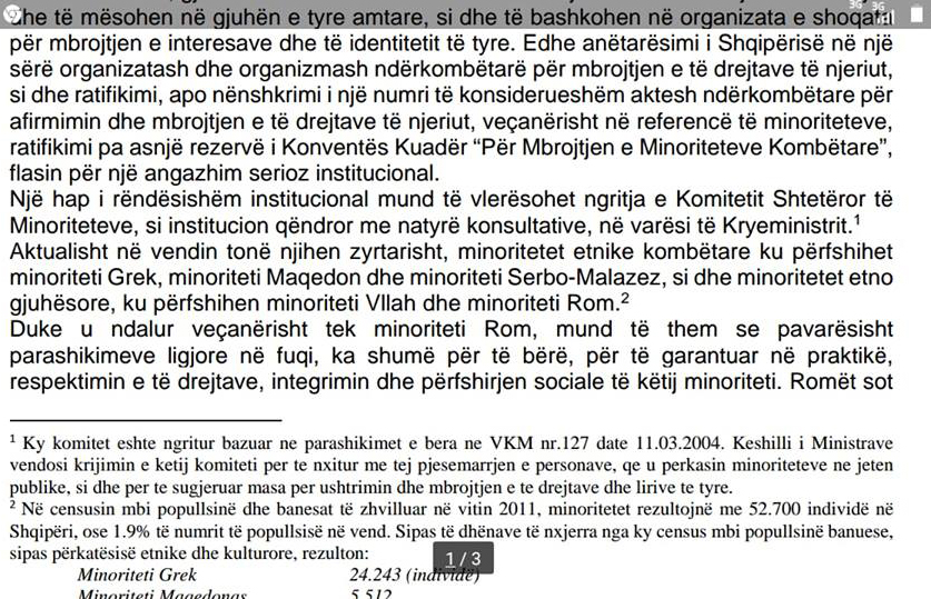„В преброяването на населението и жилищния фонд, проведено през 2011 г., в резултат на което 52 700 физически лица принадлежат към малцинствата в Албания, или 1,9% от населението в страната. Според данни, оповестени от преброяване на населението, албански граждани от етнически и културни групи се оказват: