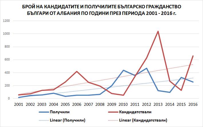 В периода 2001 – 1 май 2017 г. 2719 граждани на Албания са получили българско гражданство, на основание български произход. През същия период 5015 души са подали молби за придобиване на българско гражданство на същото основание.