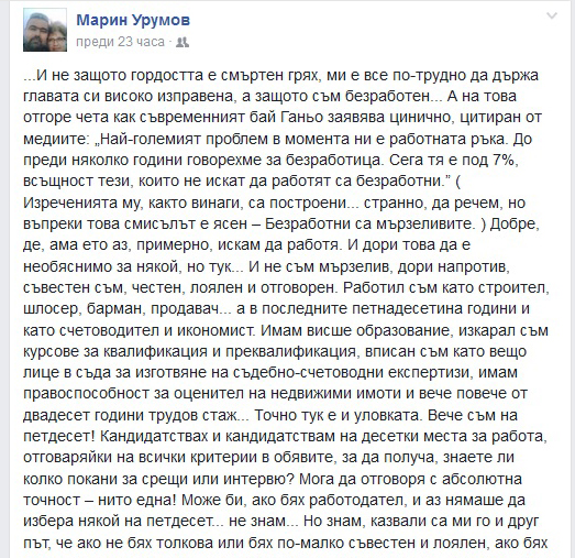 Авторът на публикувания по-долу текст Марин Урумов е на 50 години, живее във Варненско. То е с висше икономическо образование, има изкарани курсове за допълнителна квалификация и преквалификация, работил е и като строител, шлосер, барман… (Освен всичко друго, е и човек, който има талант да пише разкази и бе един от авторите, влезли в първия ни литературен сборник, издаден през 2016 г., „Черга пъстроцветна“.) Урумов е кандидатствал е, по неговите думи, по много обяви за работа. Но се е оказал ненужен… Повод за текста на Урумов, който той е качил на стената си във Фесбук и го публикуваме тук с негово съгласие, е официално изявление на българския премиер, в което се казва, че само тези, които не искат да работят, са безработни. Както и реплика на един ФБ приятел на Урумов, явно член на управляващата партия, който му написал: „Крайно време е да разбереш, моето момче, че в нас са и хлябът, и ножът, и който не е с нас, значи е против нас. За това и стоиш без работа…”.