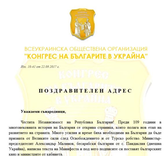 Честита Независимост на Република България! Преди 109 години в многовековната история на България се открива страница, която полага нов етап на развитието на страната. Много усилия и време бяха необходими на България да бъде призната от Великите сили след Освобождението й от Турско робство. Министър-председателят Александър Малинов, бесарабски българин от с. Пандаклия (днешна Украйна), написва текста на Манифеста и под него подписите си поставят българският княз и министрите от кабинета.