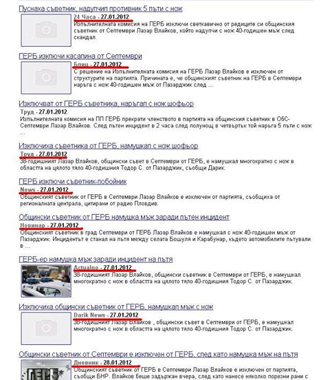 „С решение на Изпълнителната комисия на ГЕРБ Лазар Влайков е изключен от структурите на партията. Причината е, че общинският съветник на ГЕРБ в Септември наръга с нож 40-годишен мъж от Пазарджик след скандал на пътя за заслепяване с фарове. (Б.а.: Няколко удара в гърдите и гърба.) Състоянието на пострадалия е стабилизирано след спешна операция в Университетска болница „Свети Георги“ в Пловдив.“