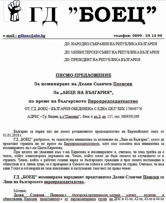 ГД „БОЕЦ“ внесохме в деловодството на Народното събрание, Министерски съвет и Президентството писмо, с което издигаме официалната НОМИНАЦИЯ на депутата Делян Славчев Пеевски за „ЛИЦЕ НА БЪЛГАРИЯ“, представящо и представляващо страната ни по време на българското европредседателството. Представили сме своите мотиви и аргументи в защита на тази кандидатура (пълният текст – по-долу) .