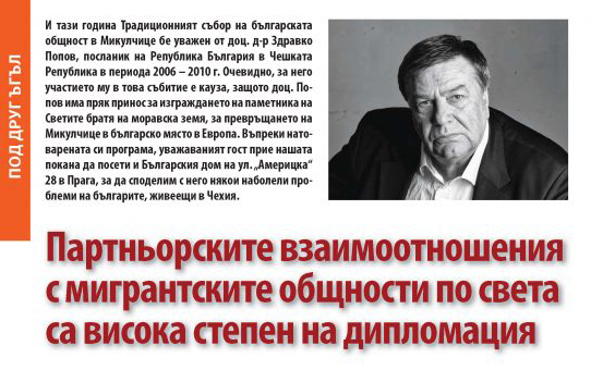 А това е част от интервю с предишния български посланик в Прага, доц. Здравко Попов, пред сп. „Роден глас“ – Чехия след Събора в Микулчице тази година, който бе дублиран. Интервюто бе препубликувано и в нашето издание (вж. тук). Доц. Здравко Попов е бил български посланик в Прага от 30 май 2006 до 30 юли 2010 г. Той е университетски преподавател, основател и директор на Дипломатическия институт към Министерството на външните работи, гл. редактор на сп. „Дипломация“.
