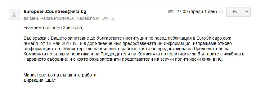 По-долу може да се види съдържанието на съобщение, което бе изпратено на МВнР, след получаването на този отговор.