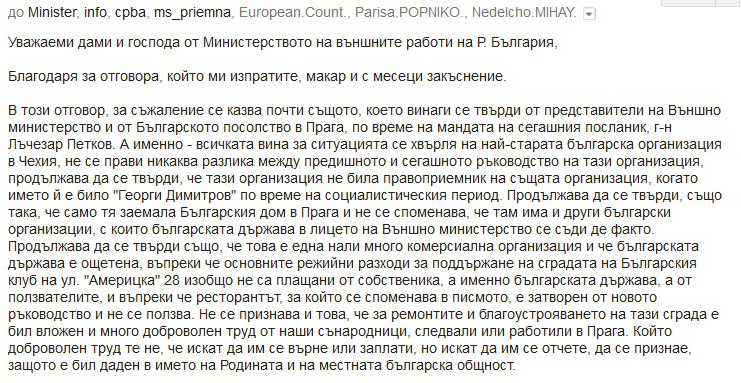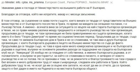 В този отговор, за съжаление се казва почти същото, което винаги се твърди от представители на Външно министерство и от Българското посолство в Прага, по време на мандата на сегашния посланик, г-н Лъчезар Петков. А именно – всичката вина за ситуацията се хвърля на най-старата българска организация в Чехия, не се прави никаква разлика между предишното и сегашното ръководство на тази организация, продължава да се твърди, че тази организация не била правоприемник на същата организация, когато името й е било „Георги Димитров“ по време на социалистическия период. Продължава да се твърди, също така, че само тя заемала Българския дом в Прага и не се споменава, че там има и други български организации, с които българската държава в лицето на Външно министерство се съди де факто. Продължава да се твърди също, че това е една нали много комерсиална организация и че българската държава е ощетена, въпреки че основните режийни разходи за поддържане на сградата на Българския клуб на ул. „Америцка“ 28 изобщо не са плащани от собственика, а именно българската държава, а от ползвателите, и въпреки че ресторантът, за който се споменава в писмото, е затворен от новото ръководство и не се ползва. Не се признава и това, че за ремонтите и благоустрояването на тази сграда е бил вложен и много доброволен труд от наши сънародници, следвали или работили в Прага. Който доброволен труд те не, че искат да им се върне или заплати, но искат да им се отчете, да се признае, защото е бил даден в името на Родината и на местната българска общност.