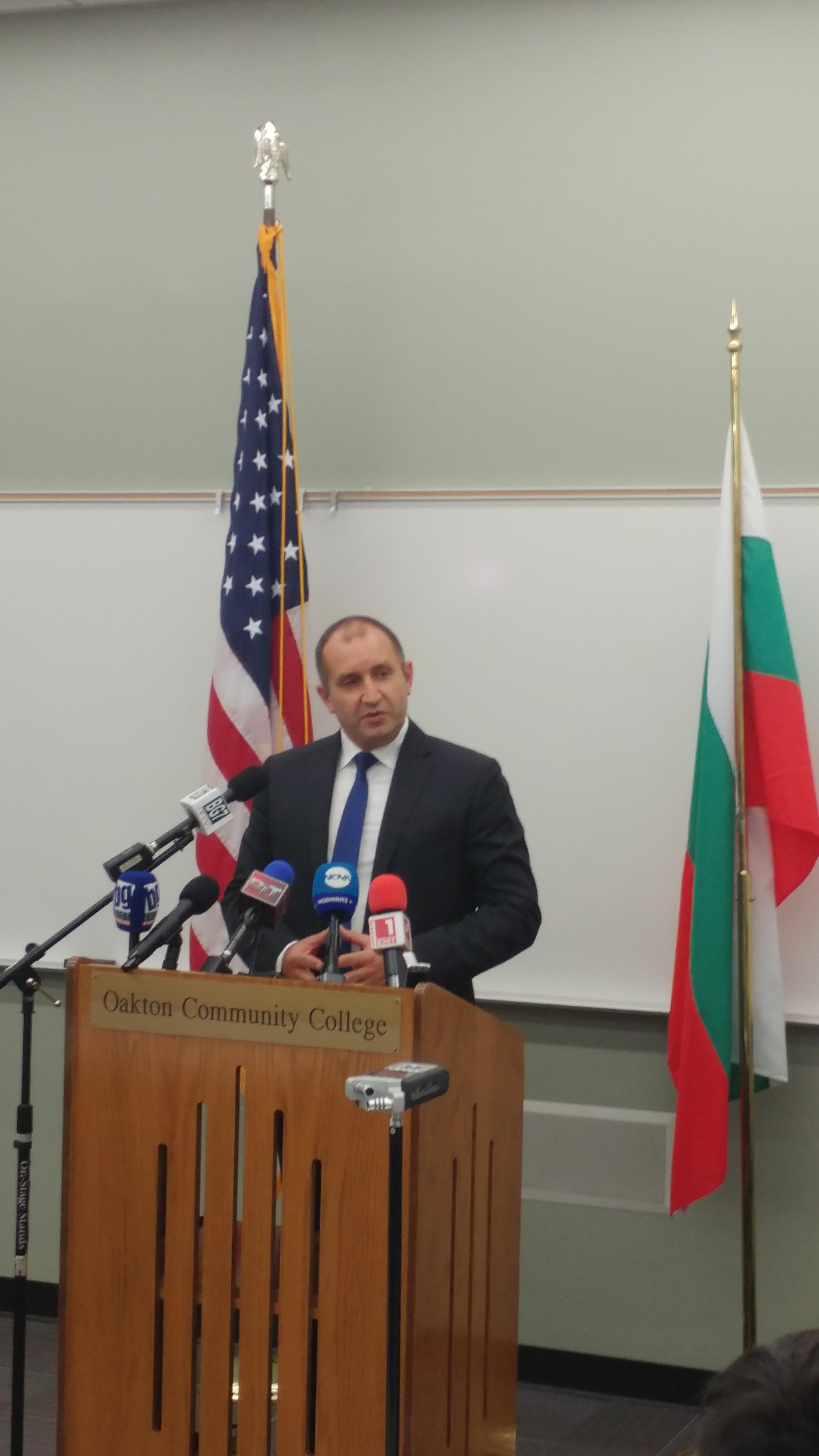 Срещата започна с приветствие от страна на президента на Oakton Community College – където се помещава БУ „Джон Атанасов“ – г-жа Джулия Смит. Г-жа Смит каза, че за нея е голяма чест да посрещне българския президент и другите официални гости в сградата на колежа.