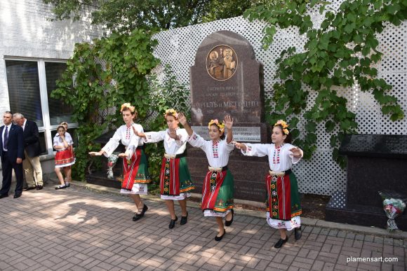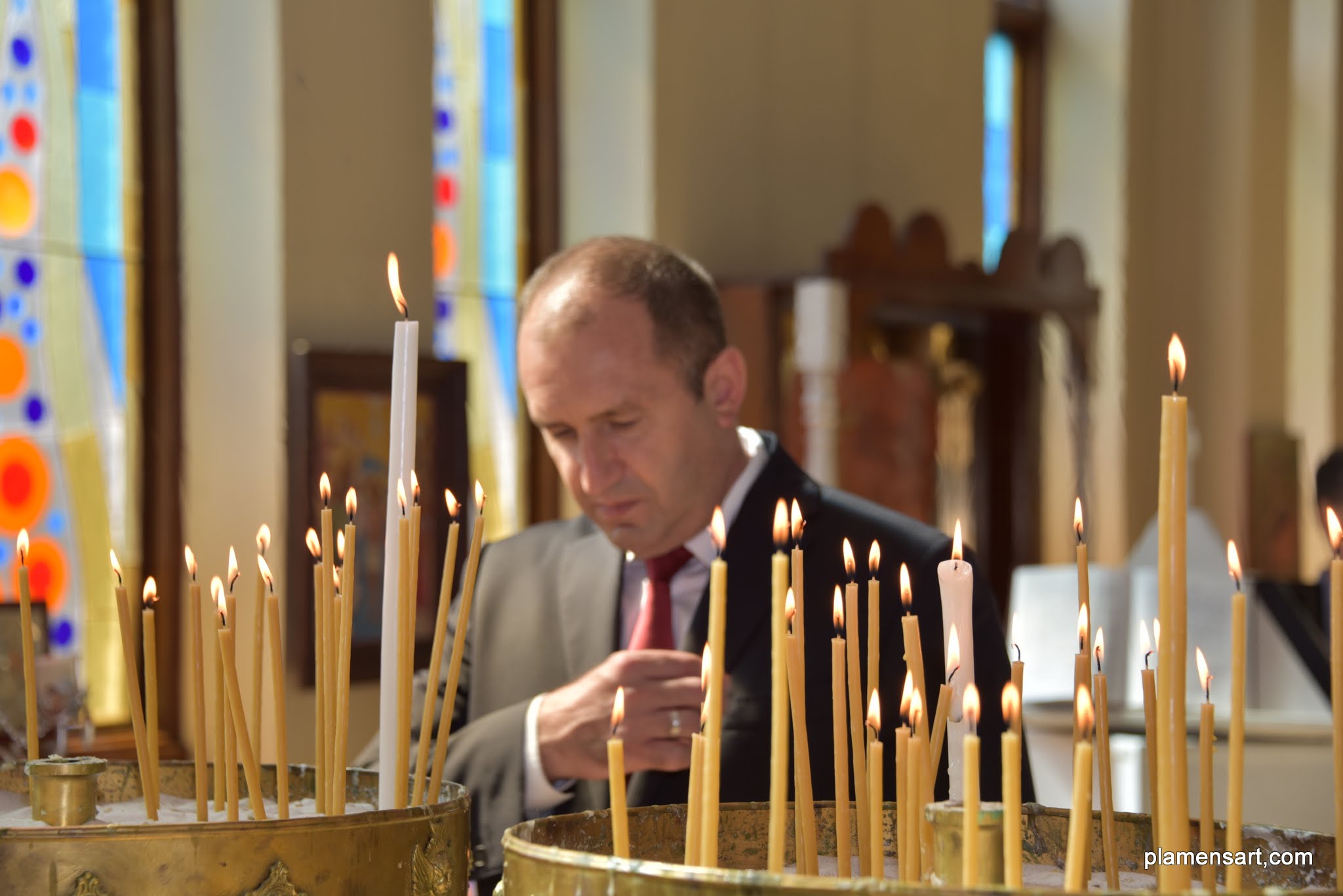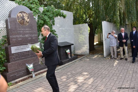 След като запалиха свещичка за здраве и благоденствие, г-н Радев и цялата делегация се отправиха към двора на църквата, където президентът поднесе цветя пред паметника на Светите братя Кирил и Методий и пред паметните плочи на Васил Левски и Христо Ботев.