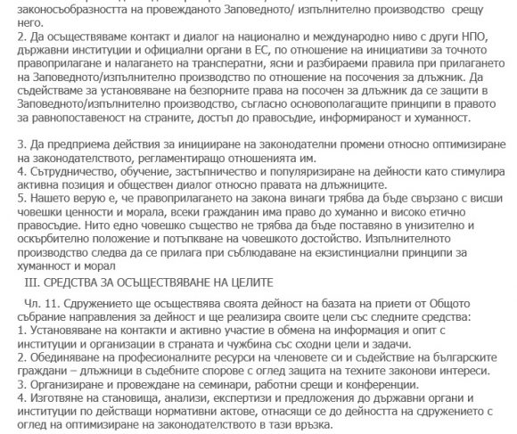 5. Нашето верую е, че правоприлагането на закона винаги трябва да бъде свързано с висши човешки ценности и морала, всеки гражданин има право до хуманно и високо етично правосъдие. Нито едно човешко същество не трябва да бъде поставяно в унизително и оскърбително положение и потъпкване на човешкото достойство. Изпълнителното производство следва да се прилага при съблюдаване на екзистинциални принципи за хуманност и морал“ – се казва още в Устава на организацията.