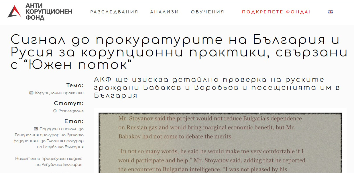 Днес, 19 септември 2017 г. Антикорупционният фонд изпрати до прокуратурите на Република България и Руската федерация сигнал с искане за проверка на информация, изнесена в български и американски медии, както и от получен до фонда сигнал с искане за проверка на: