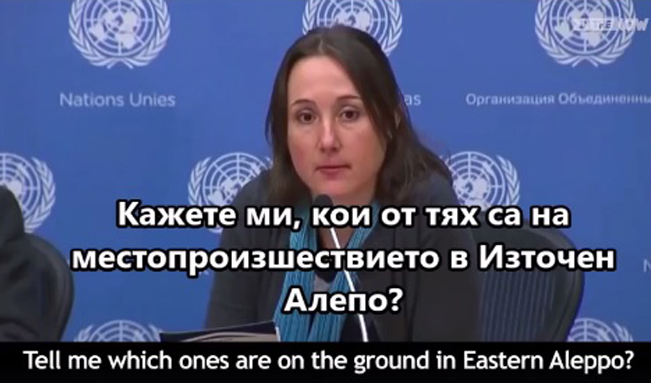 Канадската журналистка Ева Бартлет (Eva Bartlett) за медийния мейнстрийм при отразяването на войната за Сирия и по-специално в Алепо, и за източниците за този медиен мейнстрийм, които според Бартлет са неправдоподобни. Видеооткъс от пресконцеренция в ООН, проведена вероятно миналата година. Преводът на български е на групата „Око да види“. Видеото е качено в социалната мрежа Фейсбук в края на 2016 г.