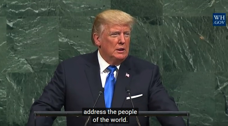 Като президент на Съединените щати, аз винаги ще поставям Америка на първо място, точно като вас, като лидерите на вашите държави, които винаги и всякога трябва да поставяте на първо място вашите държави. Всички отговорни лидери имат задължението да служат на собствените си граждани, а националната държава остава най-доброто средство за издигане на човешкото положение.