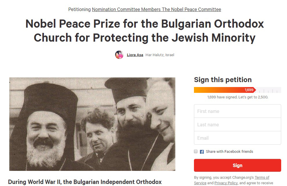 Българската православна църква е номинирана за Нобелова награда за мир, за спасяването на 48 000 български евреи от лагерите на смъртта през Втората световна война. Номинацията е внесена официално в Нобеловия комитет в началото на януари, по инициатива на бившия министър на здравеопазването на Израел и депутат ген. д-р Ефраим Снех, професора по право от университета в Хайфа – Моше Кешет и адвокат Моше Алони, и е подкрепена от подписите на повече от 200 наследници на спасени български евреи.
