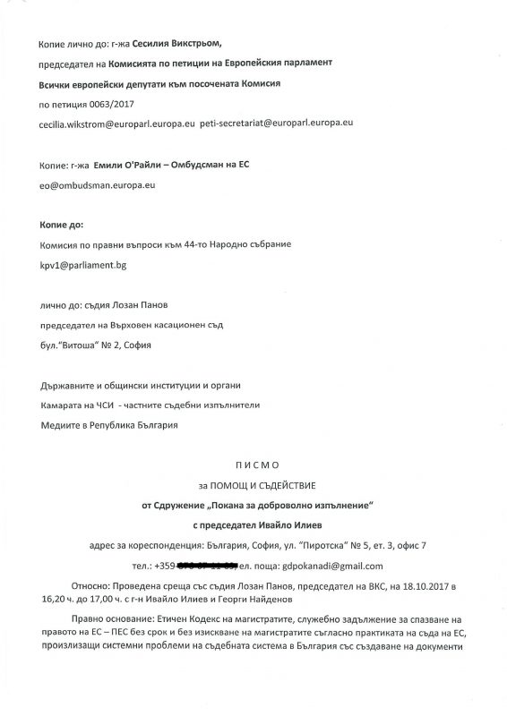 Представители на Сдружение „Покана за доброволно изпълнение“ са се срещнали на 18.10.2017 г. с председателя на Върховния касационен съд Лозан Панов. Тема на срещата са били проблемите за прилагане на правото на ЕС в България. Днес, два дни след тази среща, Сдружението е изпратило до председателя на Комисията по петиции на ЕС Сесилия Викстрьом, европедупатите от пособената комисия, омбудсмана на ЕС Емили О’Райли, Комисията по правни въпроси към 44-тото НС и до председателя на ВКС Лозан Панов писмо за помощ и съдействие.