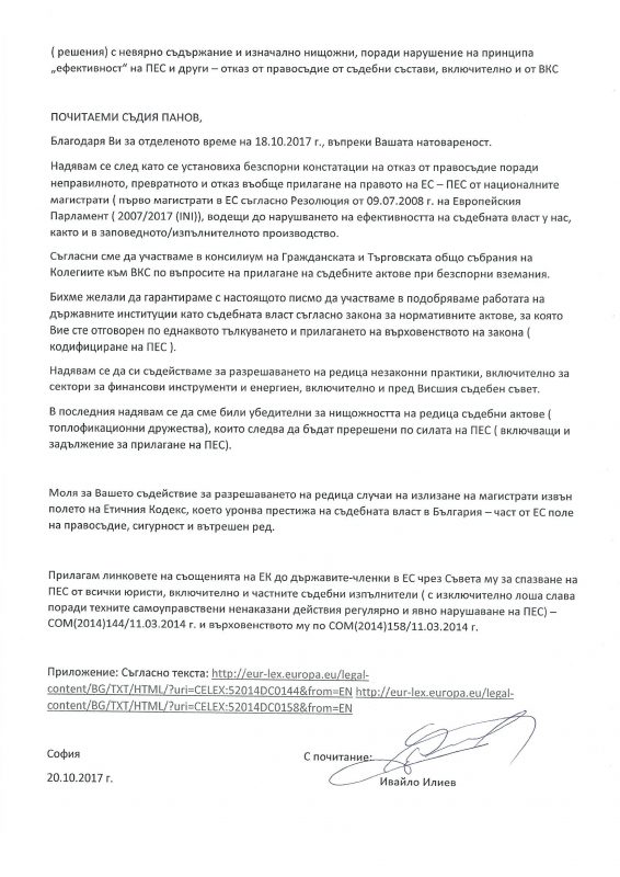 Съдържанието на това писмо, в което се призовава за съдействие за „разрешаването на редица случаи на незаконни практики“, за „излизане на магистрати извън правилата на Етичния кодекс, което уронва престижа на съдебната власт в България“ и др., може да се види по-долу.