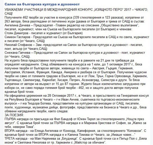 САЛОНЪТ ЗА БЪЛГАРСКА КУЛТУРА И ДУХОВНОСТ ПУБЛИКУВА НА СВОЯТА ФЕЙСБУК СТРАНИЦА РЕЗУЛТАТИТЕ ОТ МЕЖДУНАРОДНИЯ КОНКУРС „ИЗЯЩНОТО ПЕРО” 2017 – ЧИКАГО, САЩ.