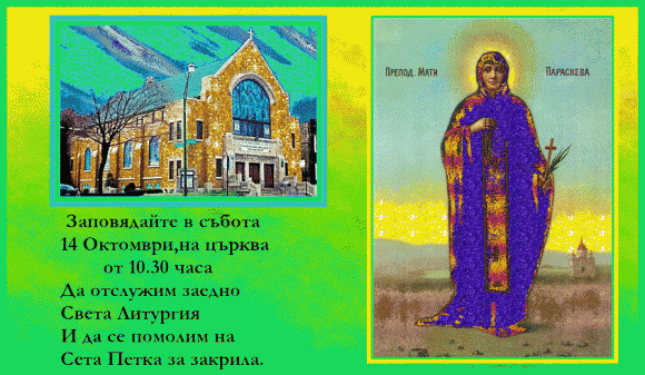 Заповядайте днес, 14 октомври, от 10.30 часа, в храма „Св. Иван Рилски Чудотворец“ в Чикаго. Да отслужим Света литургия заедно и да се помолим на Света Петка Българска за закрила.