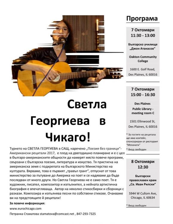 На 7 октомври преди обед Светла Георгиева ще има творческа среща с ученици, учители и родители от БУ „Джон Атанасов“, която е от 11.30 до 13.00 ч. А от 15.00 до 16.30 ч. ще изнесе рецитал в Des Plaines Public Library – meeting room C . Входът е свободен.