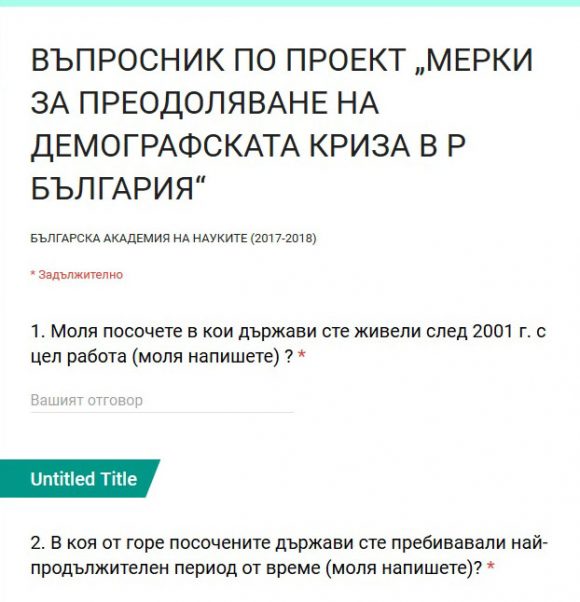 Институтът за изследване на населението и човека при Българската академия на науките разработи Въпросник по проект „МЕРКИ ЗА ПРЕОДОЛЯВАНЕ НА ДЕМОГРАФСКАТА КРИЗА В Р. БЪЛГАРИЯ“. Въпросникът е насочен към българите извън пределите на страната.