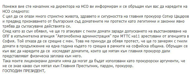 След като аз съм обявил, че ще го атакувам с гнили домати заради допускането на възстановяване на ОПГ в изпълнителна агенция „Автомобилна администрация“ при МТТС на 11 арестувани от агенцията в София. Той отказа да се срещне с мен. Това ме принуди да обявя протест, че ще го замерям с гнили домати в продължение на една година, където го срещна в рамките на софийска община. Обръщам се към вас да наредите да се изследват доматите, които ще мятам към главния прокурор дали представляват физическа заплаха към него.