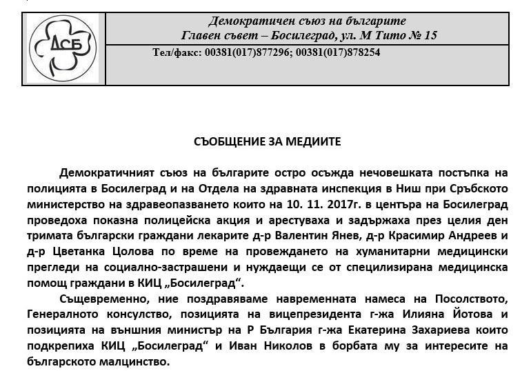 Босилеград, 12 ноември 2017 г. Демократичният съюз на българите остро осъжда нечовешката постъпка на полицията в Босилеград и на Отдела на здравната инспекция в Ниш при Сръбското министерство на здравеопазването, които на 10.11.2017 г. в центъра на Босилеград проведоха показна полицейска акция и арестуваха и задържаха през целия ден тримата български граждани – лекарите д-р Валентин Янев, д-р Красимир Андреев и д-р Цветанка Цолова, по време на провеждането на хуманитарни медицински прегледи на социално застрашени и нуждаещи се от специлизирана медицинска помощ граждани в КИЦ „Босилеград“.