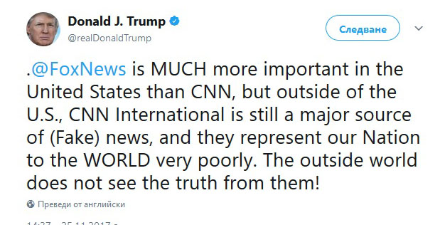 „Fox News е МНОГО по-важна в Съединените щати от CNN, но извън САЩ CNN International все още е основен източник на (фалшиви) новини и те представят нашата нация по СВЕТА много зле. Външният свят не вижда истината от тях!“