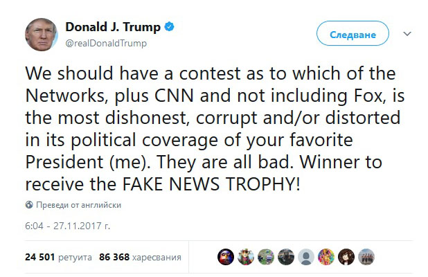 „Трябва да имаме състезание за това коя от телевизиите, плюс CNN и без Fox, е най-нечестната, корумпирана и / или изопачаващата в политическото си отразяване на любимия ви президент (мен). Всички са лоши. Победителят ще получи FAKE NEWS ТРОФЕЙ!“