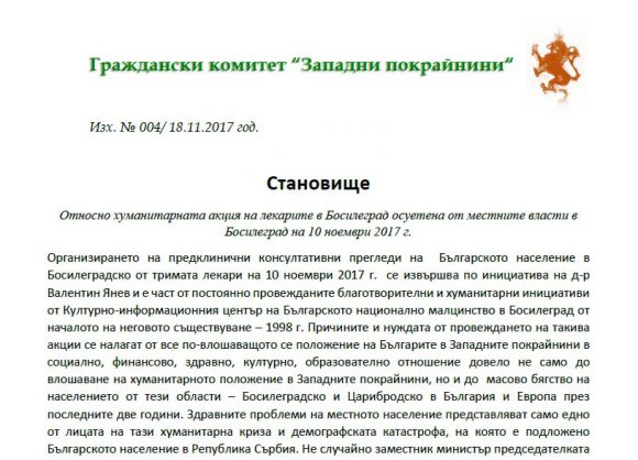 СТАНОВИЩЕ на Граждански комитет „ЗАПАДНИ ПОКРАЙНИНИ“ относно хуманитарната акция на лекарите в Босилеград, осуетена от местните власти в Босилеград на 10 ноември 2017 г.