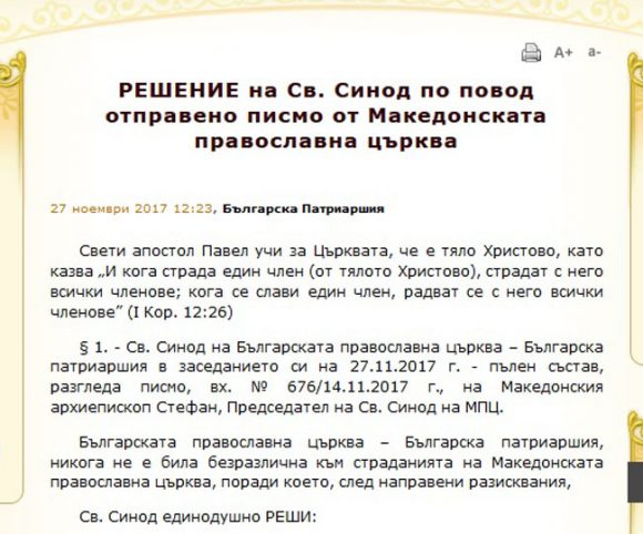 § 1. – Св. Синод на Българската православна църква – Българска патриаршия в заседанието си на 27.11.2017 г. – пълен състав, разгледа писмо, вх. № 676/14.11.2017 г., на Македонския архиепископ Стефан, Председател на Св. Синод на МПЦ.