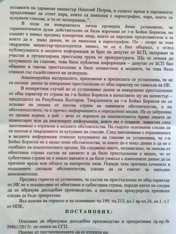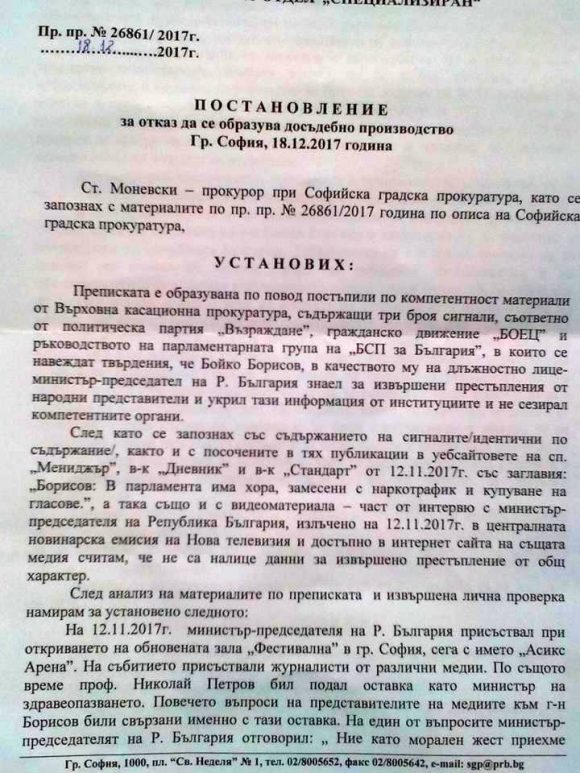 Постановлението за отказ от образуване на досъдебно производство е с дата 18 декември 2017 г. и е издадено от Ст. Моневски, прокурор при Софийска градска прокуратура. Аргументите на прокурора за отказа да образува досъдебно производство читателите могат да видят в приложеното по-долу факсимиле и… да си направят изводите сами.