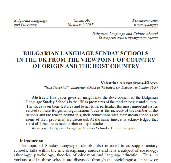 Статията на д-р ВАЛЕНТИНА АЛЕКСАНДРОВА-КИРОВА „Българските неделни училища във Великобритания от гледна точка на страната на произход и на приемащата страна“ излезе от печат в сп. „Български език и литература“, Vol. 59, No. 6, 2017 (на английски език).