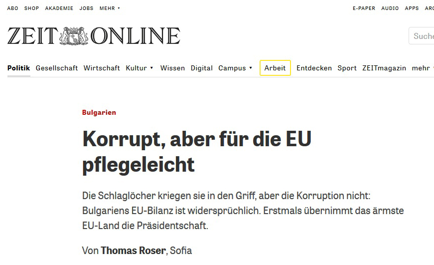 „Корумпирана, но не създава проблеми за ЕС“ – под това заглавие германският в.“Ди Цайт“ представи в четвъртък България като председател на Съвета на ЕС от 1 януари. За пръв път тази най-бедна страна в ЕС поема тази позиция, пише изданието и допълва, че българите може да са запълнили дупките по пътя между летището в София и НДК, да са напълнили града с 3000 камери и каруците да изчезнат от улиците на столицата, но не са поставили под контрол корупцията.“ – из информация на „Дневник“