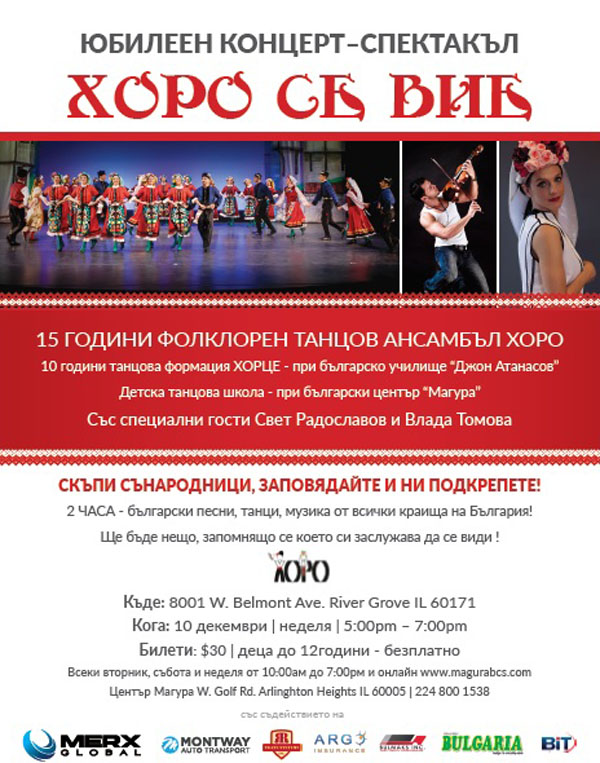 На 10 декември, неделя, от 17 до 19 часа, ще се състои Юбилеен концерт-спектакъл на фолклорен танцов ансамбъл „Хоро“, който навършва 15 години от своето основаване, в залата на Guerin College Prep High School на адрес 8001 W. Belmont Ave, River Grove, IL 60171. Събитието ще отбележи и 10 години от създаването на танцова формация „Хорце“ при Българско училище „Джон Атанасов“. Концертът ще бъде с участието на детска танцова школа при център „Магура“ и специалните гости Свет Радославов и Влада Томова. Прекрасни танци и песни – от Пирин през Шоплука до белият Дунав, от Родопите през китка Тракия до равна Добруджа – да се почувстваме горди заедно с неповторимото богатство на българския фолклор, завещан от предците ни, и затова, че сме БЪЛГАРИ!