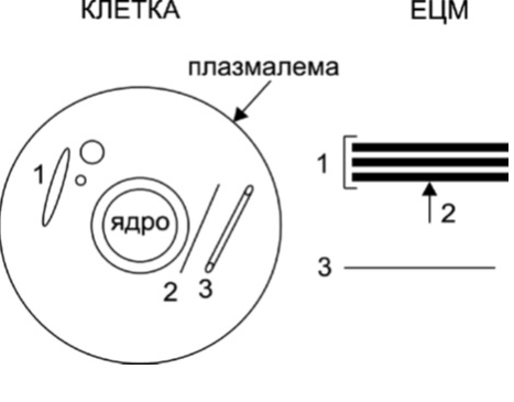 Фигура 1. Основни клетъчни органели и матриксни структури. Плазмалемално-цотоскелетните органели и някои матриксни структури не са отразени на фигурата. ЕЦМ, екстрацелуларен матрикс. От: (2a).