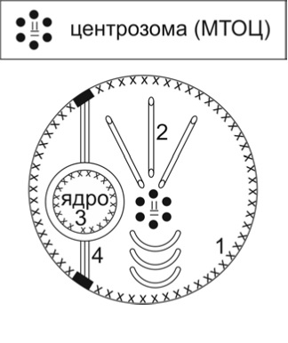 Фигура 2. Схема на микротубул-организиращ център, изграден от центрозома, съставена от две центриоли (=) и перицентриоларен материал (γ-tubulin ring complexes) (•), разположен в транс зоната на комплекса на Голджи ( 1). Mикротубули (2), нуклеарна ламина (3ххх), интермедиерни филаменти (4), субплазмалемален скелетон (ххх).