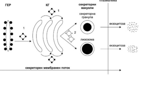 Фигура 3. Схема, представяща секреторен мембранен поток на протеини (секреция на протеини, включително фиброгенни протеини). Обърнете внимание на локализацията на COP (coated protein) везикулите (1) и клатрин-облечените везикули (2). ГЕР – гранулиран ендоплазматичен ретикулум; КГ – комплекс на Голджи. Секреторният поток е антерограден, кинезин-зависим – от ГЕР през КГ до плазмалемата. От: (2а).