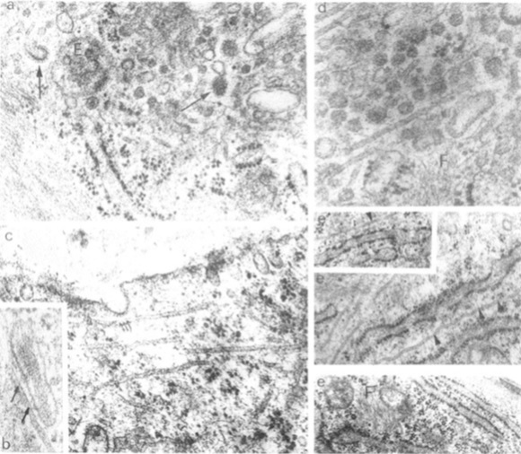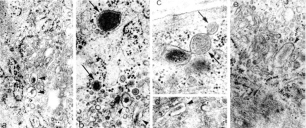 Фигура 5. Електронно-микроскопски микрографии на секреторен фенотип васкуларни гладкомускулни клетки на експериментални животни. a. Асоциирани с комплекса на Голджи клатрин-облечени везикули (стрелки). b. Елонгирана вакуола, свързана с микротубул чрез къси филаментозни структури (две стрелки). c. Произхождащ от плазмалемата клатрин-облечен везикул (три стрелки). d. Група от Голджиеви везикули, разположени между микротубули. e. Микротубули, асоциирани с гранулиран ендоплазматичен ретикулум. a, c, d x 50 000; b x 80 000; e x 20 000. От: (8).