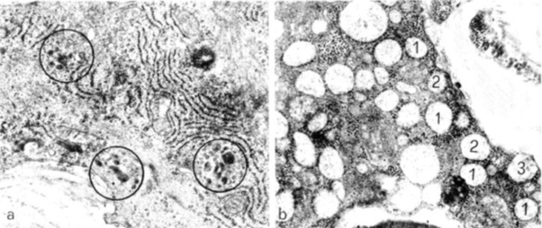 Фигура 6. Електронно-микроскопски микрографии на секреторен фенотип васкуларни гладкомускулни клетки на експериментални животни, третирани с субантимитотични дози колхицин. Клетките отговарят на третирането с (a) натрупване на секреторни гранули (посочени в кръгове) или (b) вакуоларен тип дилатация на цистерните на гранулирания етдоплазматимен ретикулум, някои от които достигат до плазмалемата (1, 2, 3). a, b x 10 000. От: (8).