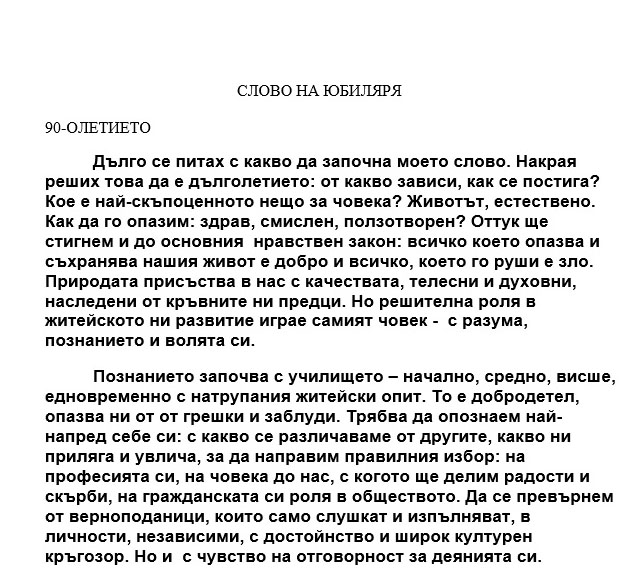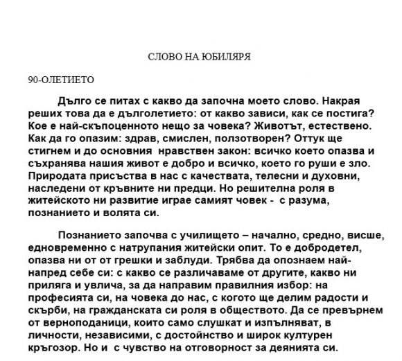 Текстът, публикуван по-долу, е слово на д-р Александър Попов – лекар, обществен деец и писател, произнесено на тържество по повод неговия 90-годишен юбилей. Авторът го изпрати на нашето издание с желание да бъде публикувано.