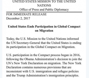 Като припомня, че участието на Вашингтон в този проект започва през 2016 г. в рамките на администрацията на Барак Обама, американската мисия обясни, че декларацията от Ню Йорк, приета на 19 септември 2016 г., „съдържа множество разпоредби в противоречие с политиката на САЩ по въпросите на имиграцията и бежанците и с принципите на администрацията на Тръмп относно имиграцията, заради които президентът на САЩ реши, че страната му ще приключи с участието си в проекта“.