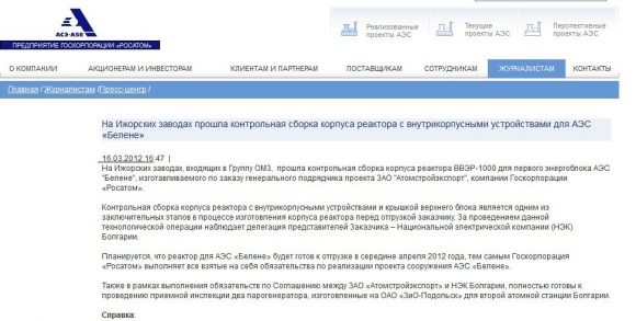 Например на 17 март 2012 г. „Атомстройекспорт” се похвали, че първият реактор е контролно сглобен – успешно и ще отпътува за България още следващия месец.
