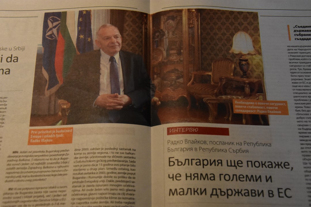 – Вие съвършено правилно отбелязвате във Вашия въпрос, че България е наистина не само пряк съсед, близък приятел, но един от най-активните адвокати на Сърбия за членство в ЕС. Мога да Ви уверя, че през последните 6-7-8 месеца, когато се определяха приоритетите, основните усилия на българското правителство и на българския министър-председател бяха насочени именно към убеждаване на нашите партньори в ЕС за необходимостта от връщане на темата за разширяване на ЕС с държавите от Западните Балкани. Ние сме наистина щастливи, че успяхме да убедим нашите партньори в това и вече смятаме, че водим едно балканско председателство. Едно председателство, което ще остане в историята като Балканско председателство. Попитахте ме за конкретните стъпки, които ще се осъществят през тези месеци. Мога да Ви кажа, че почти всеки месец има събитие, което е свързано пряко с въпроса за разширяването на ЕС със страните от Западните Балкани. Преди всичко през февруари очакваме стратегията за Сърбия и Черна гора като водещи кандидатки за членство от Западните Балкани – така е точната формулировка, която беше обявена от президента на Европейската комисия Жан-Клод Юнкер. След това през април месец се очакват редовните доклади за напредъка на държавите от региона и конкретно на Сърбия. След това през май месец стигаме до една от кулминациите на нашето председателство, свързана с приоритета Западни Балкани. На 17 май в София ще се организира среща на лидерите на държавите от ЕС с лидерите на държавите от Западните Балкани. Аз не знам дали за Вашите читатели самият факт за провеждането говори нещо, но за мен като професионален дипломат и политик, сам разбирам изключителното значение. През 2003-та година беше последната среща, на която страни от региона, и то не всички страни от Балканите, участваха в Солун, по време на гръцкото председателство, в подобна среща. Сами разбирате, че 15 години този въпрос беше настрани. Между другото, в резултат на срещата през 2003 година държави като България и Румъния получиха своя шанс за членство в Европейския съюз. Така че тази среща е наистина изпълнена с много очаквания. Но аз тук искам много ясно да кажа: основното очакване, основното усилие е насочено към създаване на възможно най-благоприятен политически климат за разглеждане на напредъка на всяка една държава. А иначе, от всяка една държава зависи по какъв начин, с каква скорост тя ще дойде в Съюза Или ако го кажем иначе: вратите са широко отворени! От отделните държави зависи, конкретно в случая от Сърбия, кога ще влезне! Но нека, все пак, напомня още нещо. Ако в началото на мандата на тази Комисия, на Европейската комисия, през 2013 година посланието на Жан-Клод Юнкер беше повече от ясно, че няма да има разширяване в рамките на този мандат, това беше обезкуражително. И аз като посланик тук съм присъствал неведнъж на срещи, или съм чувал друг тип публични изказвания от президента, преди това министър-председател Александър Вучич за необходимостта да има ясна перспектива, защото тя мотивира реформаторските кръгове. И сами знаете, че през октомври 2017 година Жан-Клод Юнкер излезе с една, бих казал знаменита за региона реч, в която нещата си дойдоха на мястото. Аз съм щастлив, че това идва и в резултат на усилията на България. Позволете ми едно последно изречение по този повод. Тези дни с минис