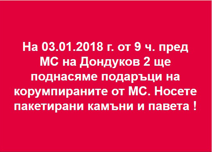 На 3 януари 2018 г., сряда, пред сградата на Министерски съвет в София на „Дондуков“ 2 ще се проведе протест под надслов „Грамада срещу корупцията“. Протестът ще започне в 9 часа сутринта местно време.