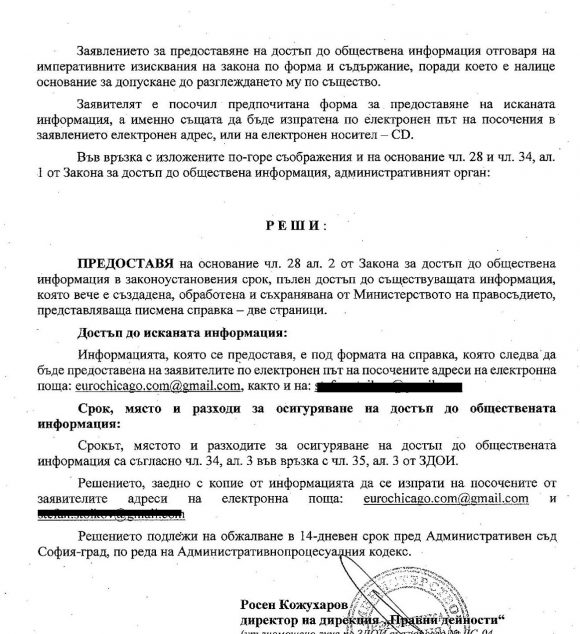 Отговорът, които получихме по ЗДОИ, е подписан от Росен Кожухаров, директор на дирекция „Правни дейности“ към Министерството на правосъдието. Към него е приложена справка, факсимиле от която можете да видите по-долу.