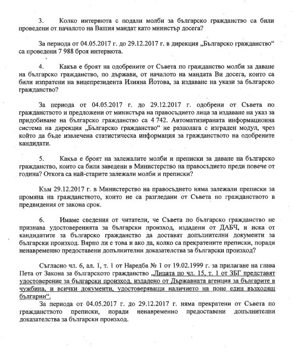 В справката пише също, че към 29.12.2017 г. в Министерството на правосъдието „няма залежали преписки за промяна на гражданството, което не са разгледани от Съвета по гражданството в предвидения от закона срок“. Това е официалният отговор на петия поставен въпрос, който е за залежалите молби и преписки.